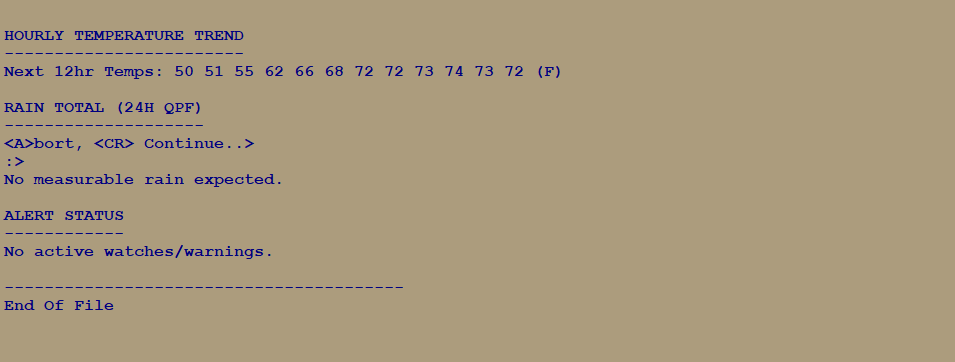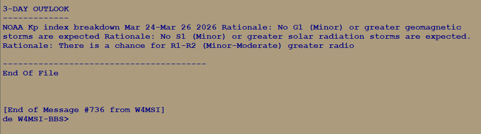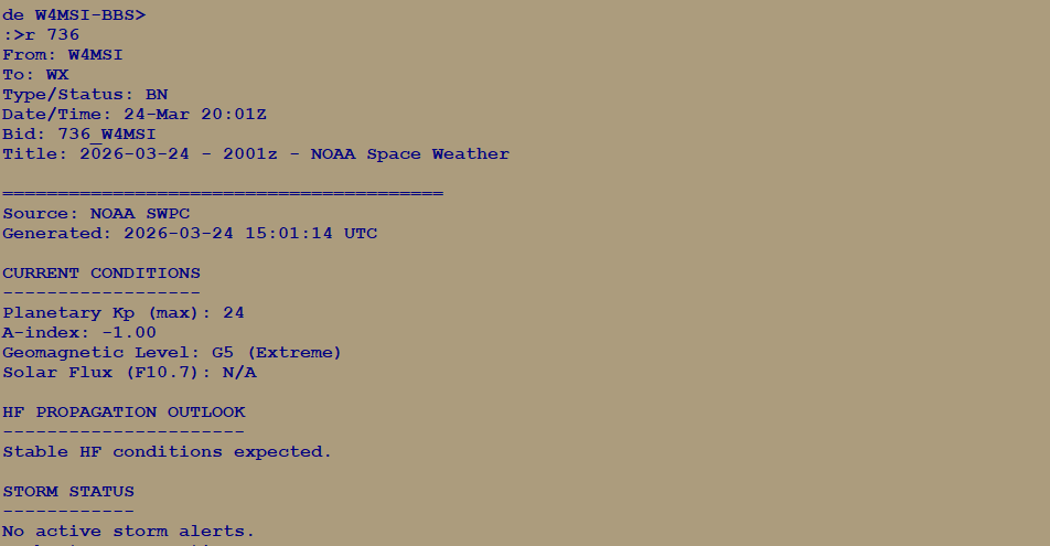 On top of that, I also have it download current NWS weather information from the Paducah field office so that we have access to offline current weather information. Then, it also pulls space weather data from NOAA. All of this information is then composed into separate bulletins to keep it organized and easy for you to retrieve the information.
