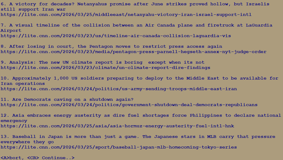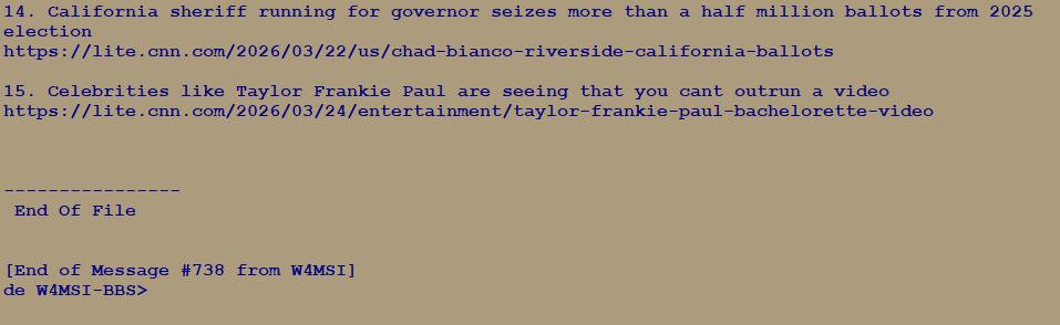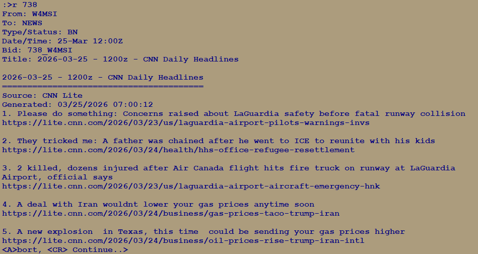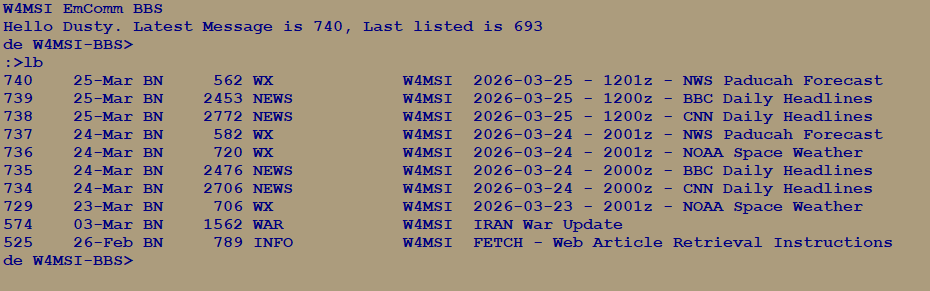 First, there is now a script that runs daily and it downloads news headlines from CNN and BBC. Let me jump in here and say that I do not align politically with these organizations and you may not either. However, they do offer valid headlines and in such a format that it’s easy to pull them from the web and create simple text based content which is what the BBS is designed for. If you think about it, a simple headline is all you need to be clued into what is going on in the nation or world for that matter and then you can dig and do more research yourself to find out more about a given situation. All I’m pulling is the headlines and therefore, there isn’t any political bias embedded. So, headlines are downloaded and posted into a new bulletin with the “NEWS” category for your to retrieve and read over RF completely offline. The script will also purge the old news bulletins and keep only the latest two posts so as not to clog up the system with “old news.”
